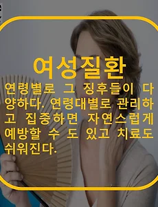 여성질환 연령별로 그 징후들이 다양하다. 연령대별로 관리하고 집중하면 자연스럽게 예방할 수 도 있고 치료도 쉬워진다. 폐경기 -월경이 영구적으로 폐지되는 폐경 후 얼마간 또는 이 시기를 말한다. -40대 후반을 넘기면서 난소기능이 저하되고 여성 호르몬 분비가 체내 요구량에 미치지 못해 생기는 신체변화이다. -40대 후반 ~50대 초반 모든 여성이 겪고 지나가는 기간이다. -폐경이행기 : 생리가 불규칙하기 시작한 이후부터 마지막 생리 시까지 약 4년 여 간의 시기이다. 여성호르몬 생성에 문제가 생기기 시작한다. -폐경이행기 증상 : 불규칙한 생리, 안면홍조, 우울, 발한, 기억력 감퇴, 피곤, 불안, 수면장애 등의 증상이 나타난다. ●증상 생식기(질)건조, 성교 시 통증, 생식기 감염, 방광염, 배뇨통, ..